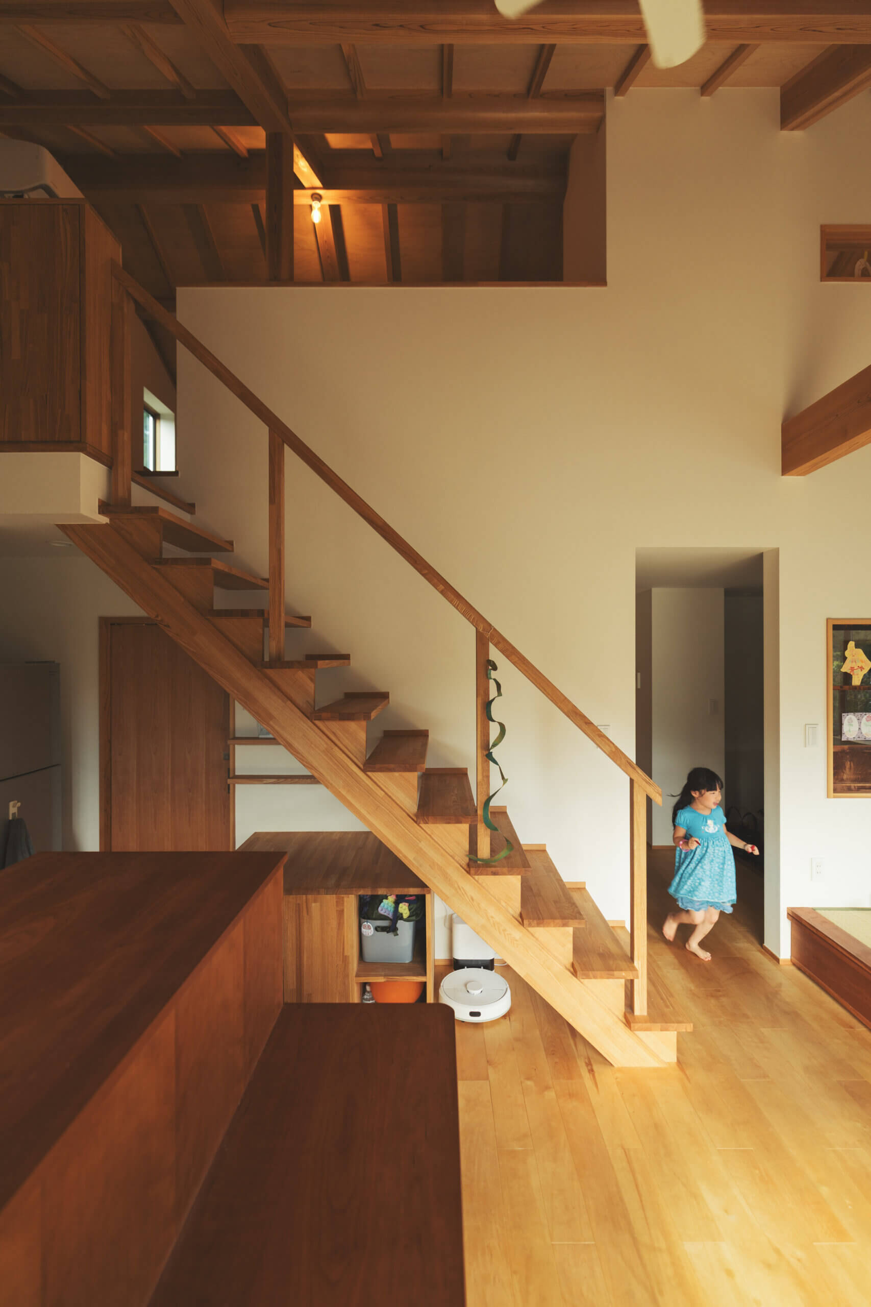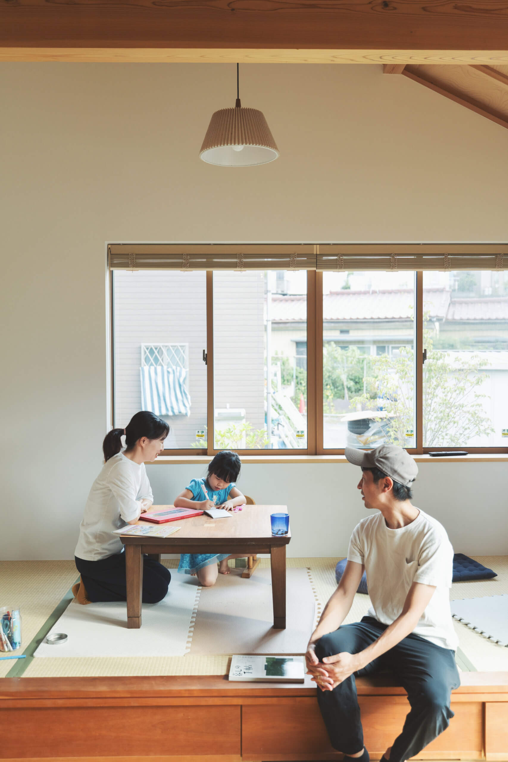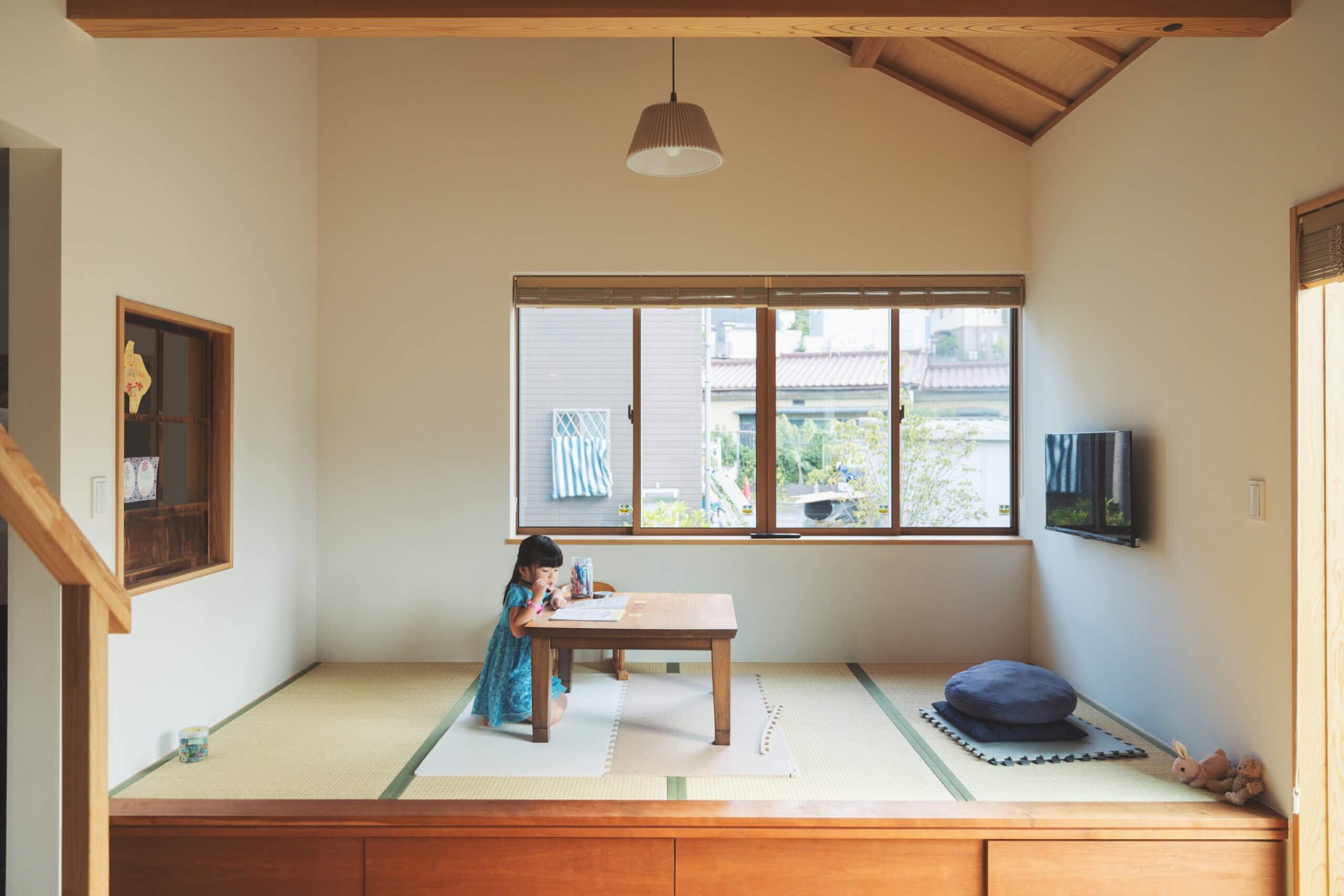 キッチンのカウンターから目線が向けられる小上がりのタタミスペースは、お子様の作業スペースや家族の寛ぎ空間に。小上がりにすることで腰かけにもなるため、ソファを置く必要もなく、必要最低限の家具だけで成立するリビングスペースになっております。