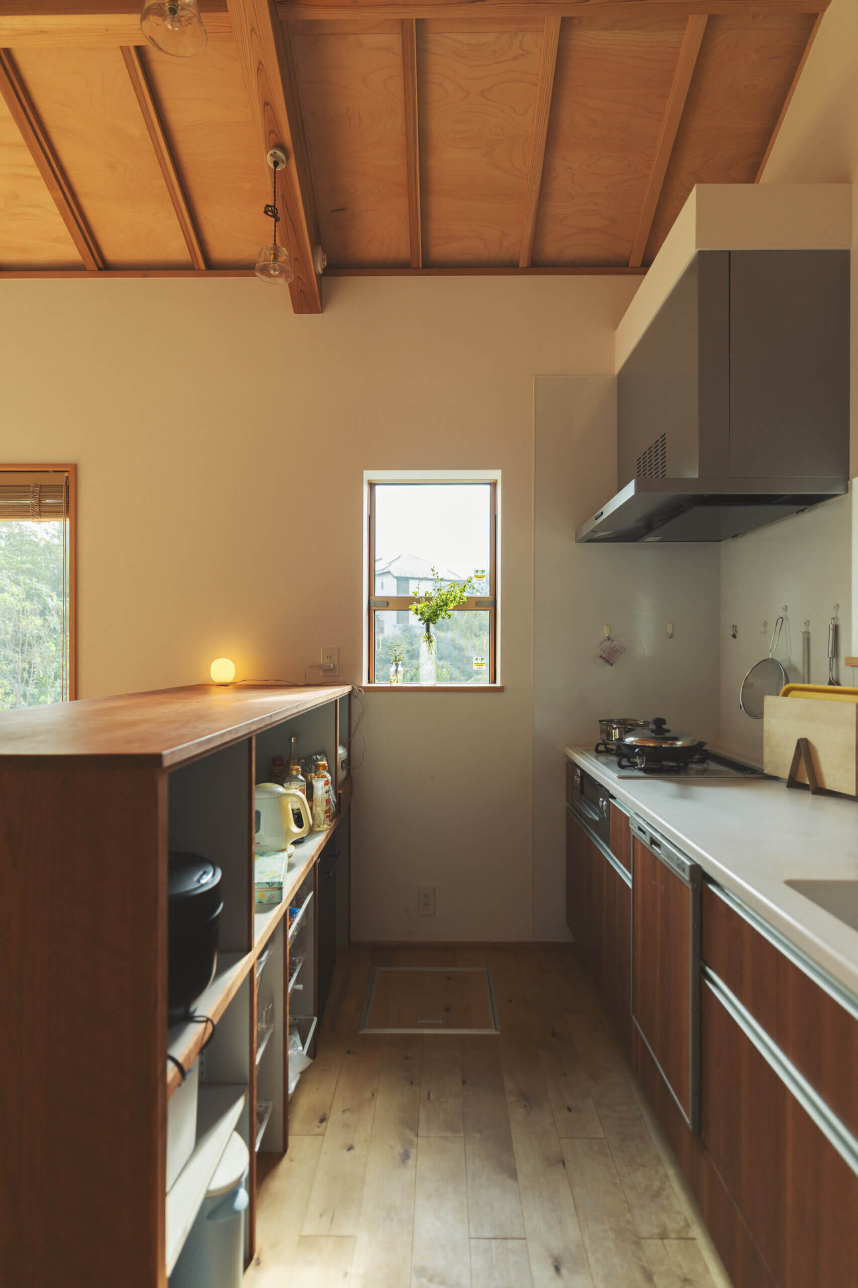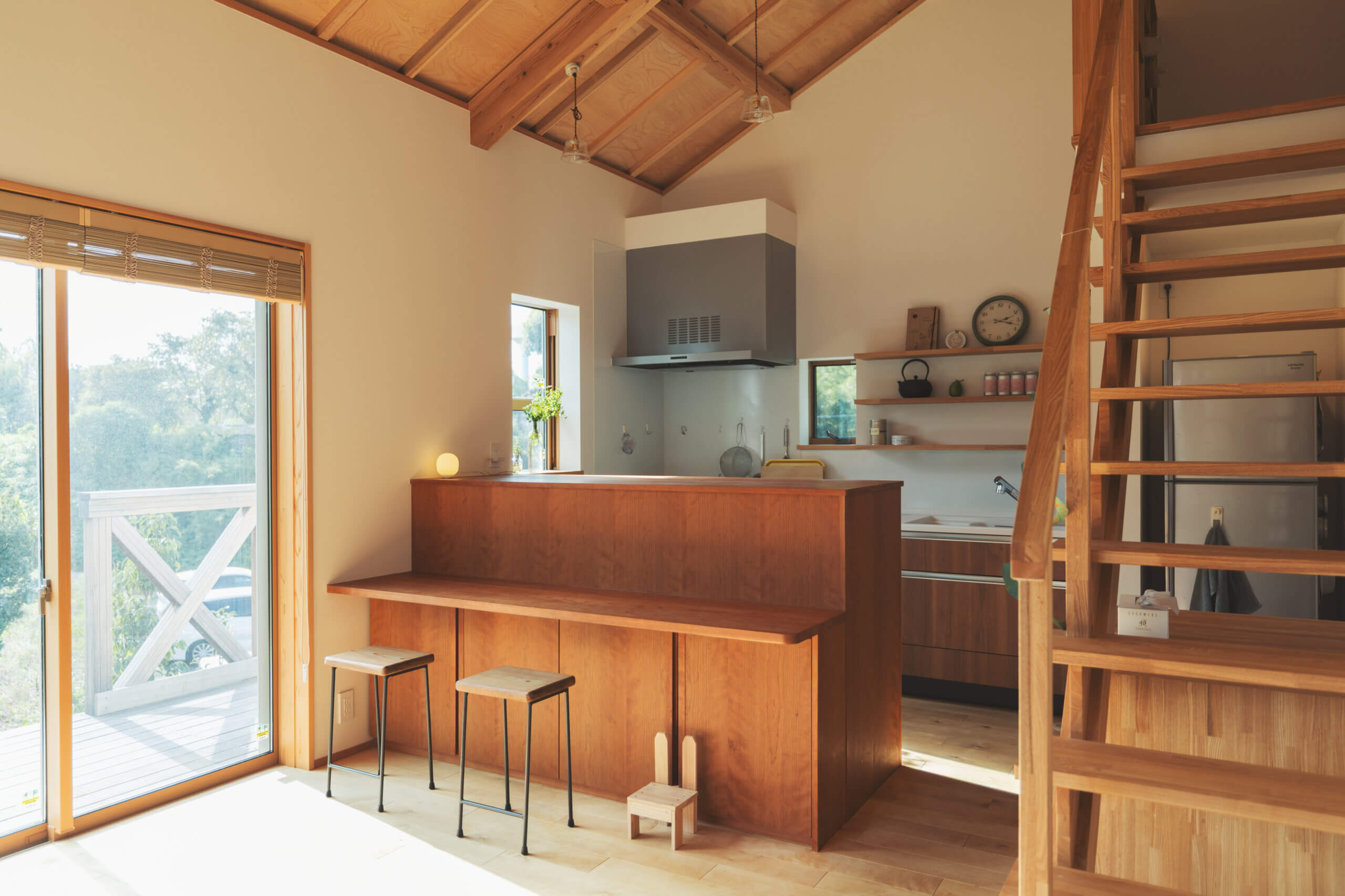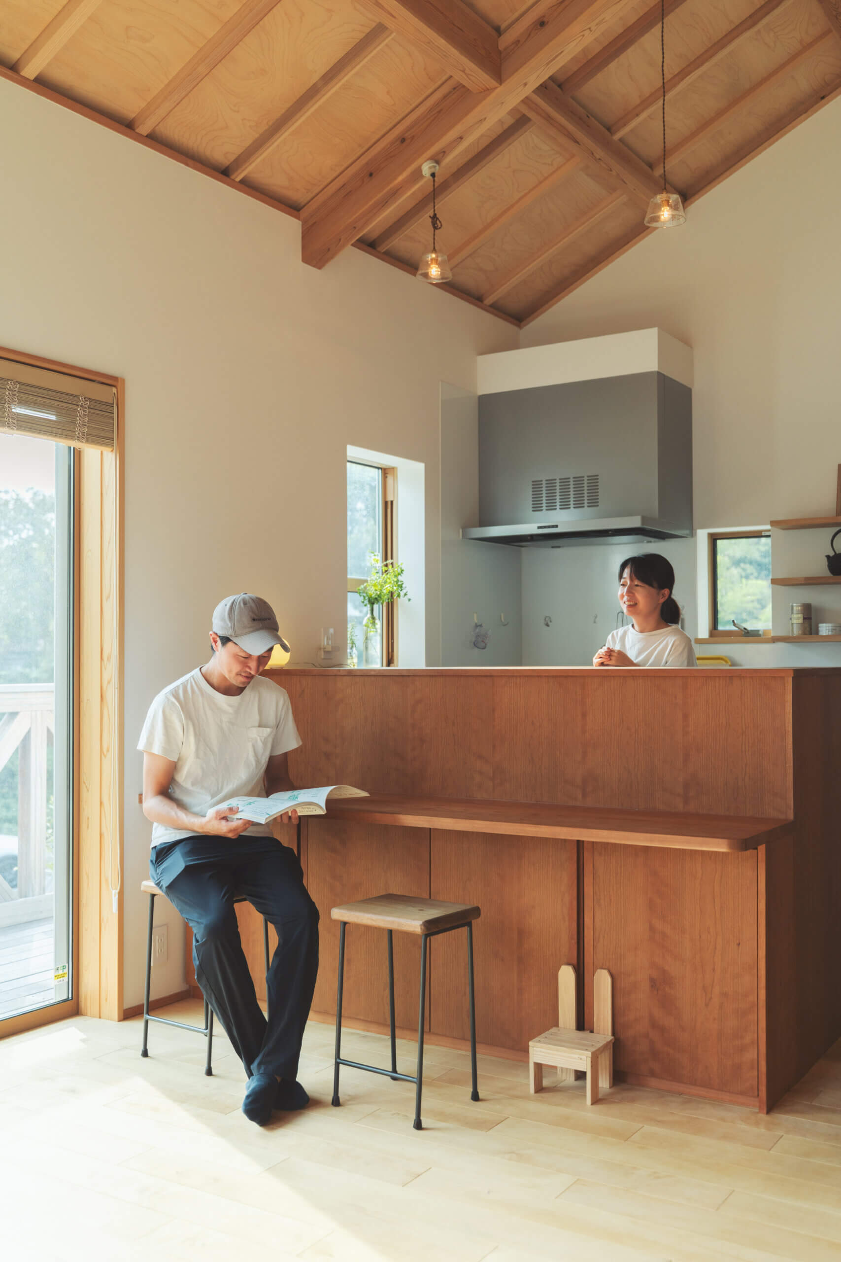 キッチンのカウンターから目線が向けられる小上がりのタタミスペースは、お子様の作業スペースや家族の寛ぎ空間に。小上がりにすることで腰かけにもなるため、ソファを置く必要もなく、必要最低限の家具だけで成立するリビングスペースになっております。