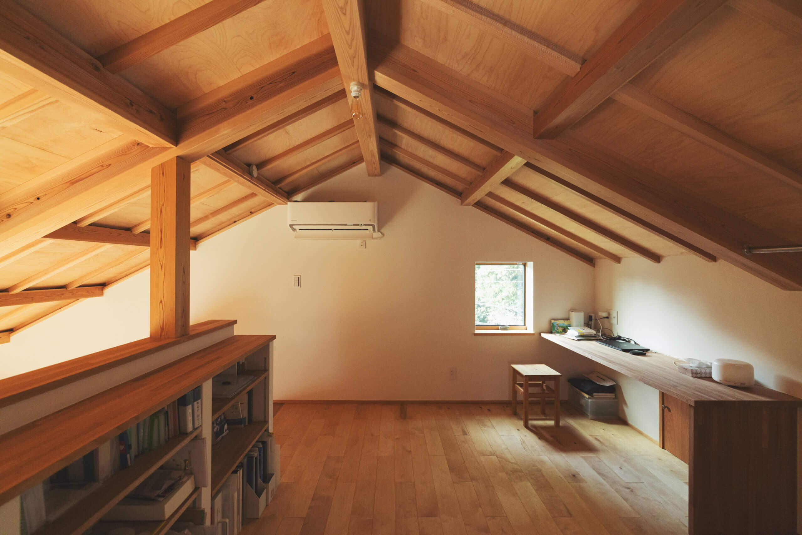 おこもり空間に感じられる場所でありながら、LDKと繋がっているため、どこかで誰かの存在を感じることができるところも魅力です。平屋と二階建てのいいとこどりと言われています。
